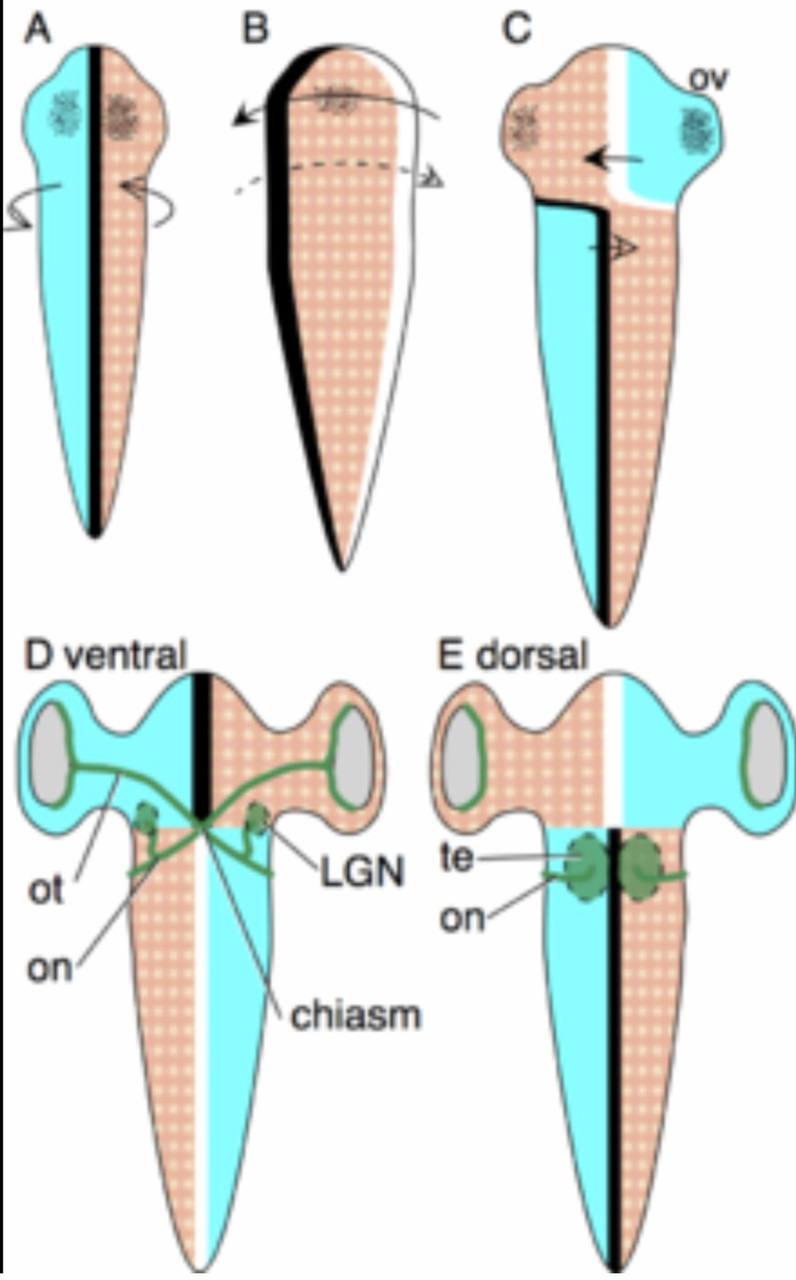 နောက်ထပ်ယူဆချက်တခုက “axial twist hypothesis” လို့ခေါ်ပြီး အောက်ပါပုံအတိုင်း embryo လေးရဲ့အပေါ်တခြမ်း (head) က ဘယ်ဖက်ကိုလည်သွားပြီး အောက်တခြမ်း (body) က ညာဖက်ကိုလည်သွားတဲ့အတွက် ဘယ်ညာထိန်းချုပ်တဲ့ဖက်မတူတာဖြစ်တယ်လို့လဲ ဆိုကြပါတယ်။