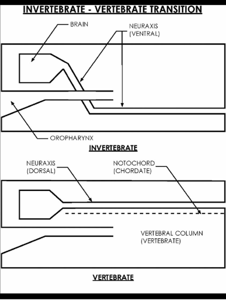 ကျောရိုးမဲ့သတ္တဝါကနေ ကျောရိုးရှိသတ္တဝါအဖြစ်ကူးပြောင်းလာတဲ့အခါ တချို့သော ကျောရိုးမဲ့တွေမှာ spinal cord နဲ့ဆင်တူတဲ့ neural networkor neural cord စပေါ်လာပါတယ်။ စပေါ်တဲ့နေရာက ဝမ်းဗိုက်ဖက်ခြမ်း (ventral) မှာဖြစ်ပါတယ်။ ကျောဖက်အခြမ်း (dorsal) ဖက်မှာက ပါးစပ်နဲ့ အစာလမ်းကြောင်းရှိနေပါတယ်။