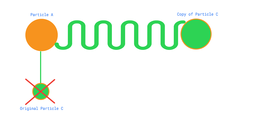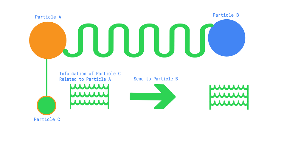 Particle A နဲ့ချိတ်ဆက်လိုက်ရုံနဲ့ Particle C ကို Particle B ရဲ့နေရာကိုပို့လိုက်နိုင်တဲ့သဘောပဲ။