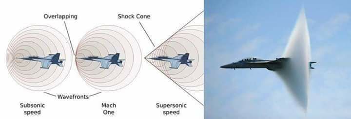 လေယာဉ်တစ်စီး လေထဲမှာဖြတ်သွားတဲ့အခါ အရှေ့မှာရှိတဲ့ လေမော်လီကျူးတွေကို တွန်းသွားရပါတယ်။ ဒီလေယာဉ် ကနေထွက်လာတဲ့အသံကလဲ လှိုင်းပုံသဏ္ဍာန် ဘက်ပေါင်းစုံကိုဖြာထွက်နေပါတယ်။