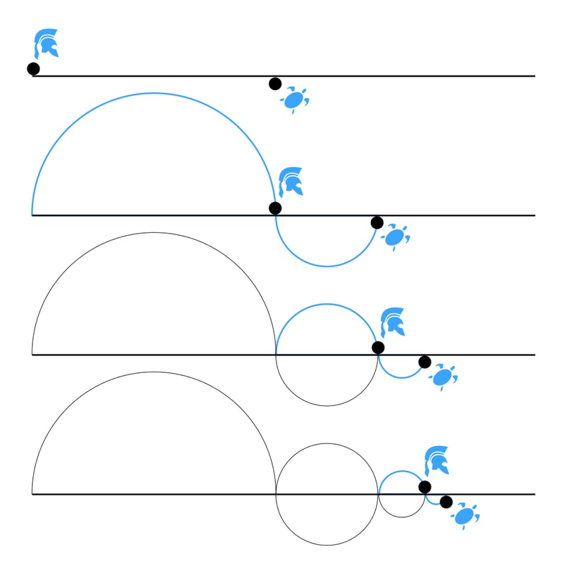အာခိလိဟာ လိပ်နဲ့ အပြေးပြိုင်နေတာ ဖြစ်လို့ လိပ်ကို နိုင်ချင်ရင် လိပ်ကိုမှီအောင် ပြေးရပါမယ်။ လိပ်ကို မှီအောင်ဆိုရင် လိပ်ရှိခဲ့တဲ့နေရာကို ပြေးရပါမယ်။