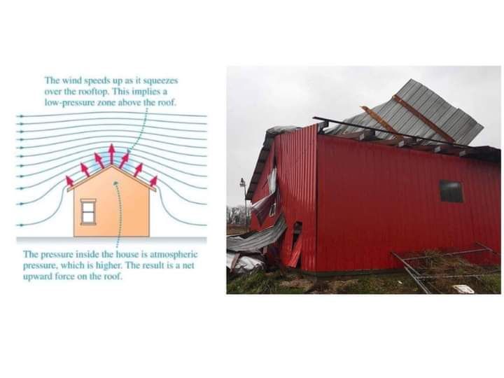 လေပြင်းတိုက်ရင် ခေါင်မိုးပေါ်မှာ ဖိအား ကျသွားပါတယ်။ အိမ်ထဲက ဖိအားက နဂိုအတိုင်းပဲ ဆိုပေမယ့် ခေါင်မိုးပေါ်နဲ့ အိမ်ထဲမှာ လေဖိအားကွာခြားသွားပါတယ် ဒီလိုနဲ့ အိမ်ခေါင်မိုးတွေ မခိုင်ရင် ပွင့်ထွက်ကုန်တာပါ…