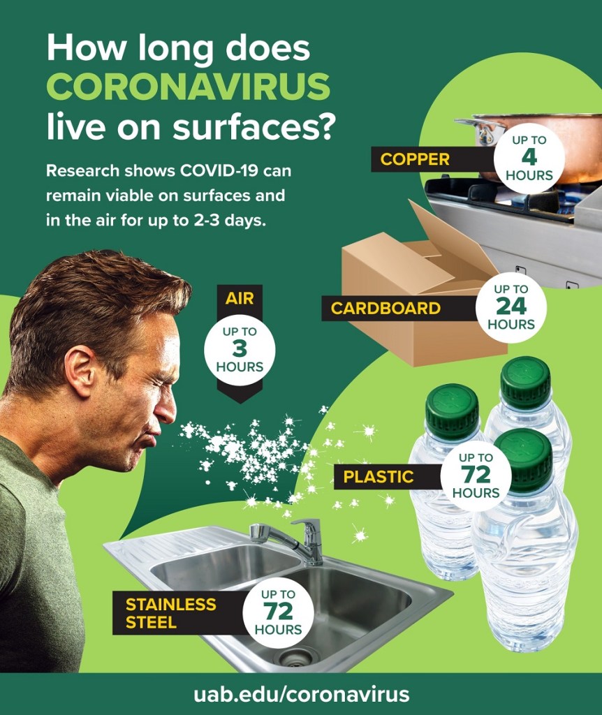 COVID-19 ပိုးဟာ မျက်နှာပြင်တွေပေါ်မှာ အသက်ရှင်နိုင်ပါတယ်။ အကြမ်းဖျင်း ၁နာရီကနေ ၇နာရီအထိ အသက်ရှင်ပါတယ်။ Plastic တွေပေါ်မှာ အကြာဆုံးပါပဲ။