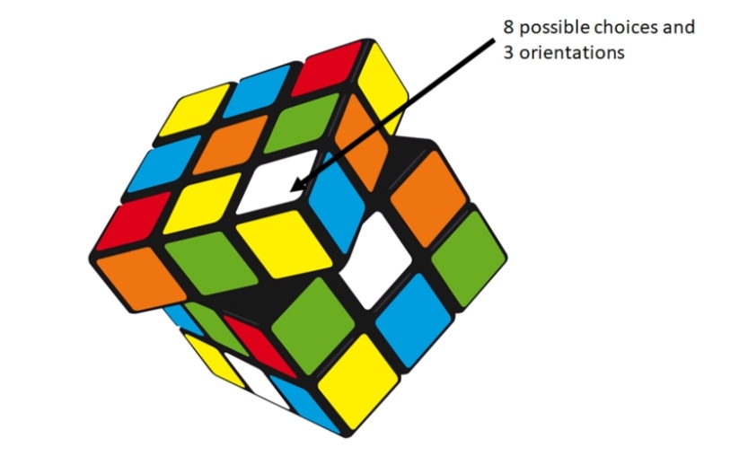 ဒါဆိုရင်… Rubik’s Cube ကို တစ်စစီ ဆွဲဖြုတ်လိုက်ပြီ လို့ စိတ်ကူးယဉ် လိုက်ပါ။ ပြီးရင် corner (ထောင့်) တွေကို အရင်စဉ်းစား ကြည့်တာပေါ့။ Corner မှာ ထည့်နိုင်တဲ့ piece က 8 မျိုးရှိပါတယ်။ 8 possible choice ပေါ့။ Corner (ထောင့်) နေရာက 8 နေရာ ၊ ရှိတဲ့ piece က 8 တုံး ဆိုတော့ possible arrangement က ဘယ်နှခု ဖြစ်မလဲ? အဖြေက 8! ပါ။