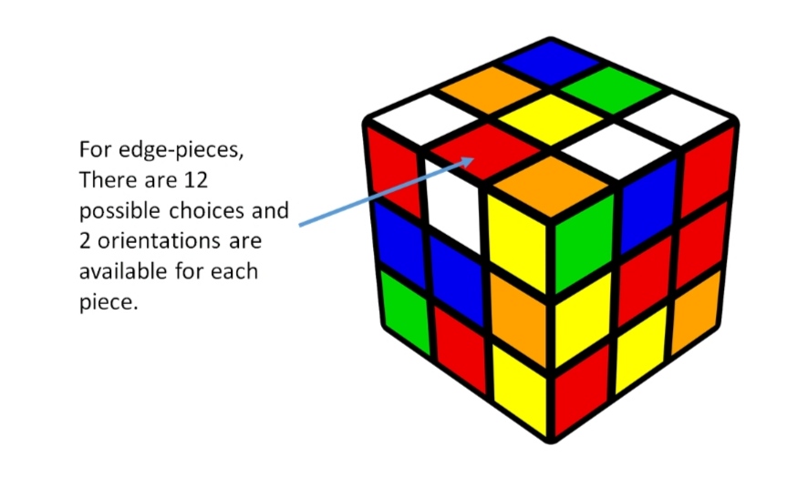 ဒါပေမယ့် မျက်နှာပြင်ရဲ့ orientation ကိုလည်း ထည့်စဉ်းစား ရဦးမယ်။ မျက်နှာ ပြင်က 2 ဖက်ဆိုတော့ ဖြစ်နိုင်တဲ့ orientation က 2 မျိုးပေါ့။ Orientation က 2 မျိုး ၊ 2 မျိုး စီ 12 ခါ ဖြစ်နိုင်တော့ 2¹² ပေါ့ဗျာ။ ဒါဆိုရင် edge pieces တွေ အတွက် ဖြစ်နိုင်တဲ့ all possible arrangement တွေက –