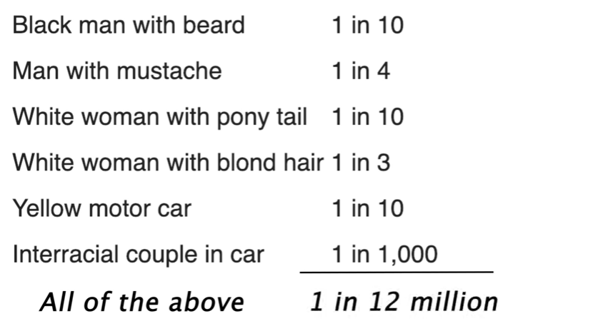 လုယက်မှုဟာလည်း ဒီသဘောပါပဲ။ သင်္ချာပညာရှင်တွက်ပြတာက 1 in 12 million chance ရှိပေမယ့် မိသွားတဲ့အခါမှာ လုသွားတဲ့အတွဲက ဒီအတွဲဖြစ်နိုင်တယ်ဆိုတဲ့ Chance က 100% ဖြစ်သွားတာပါ။