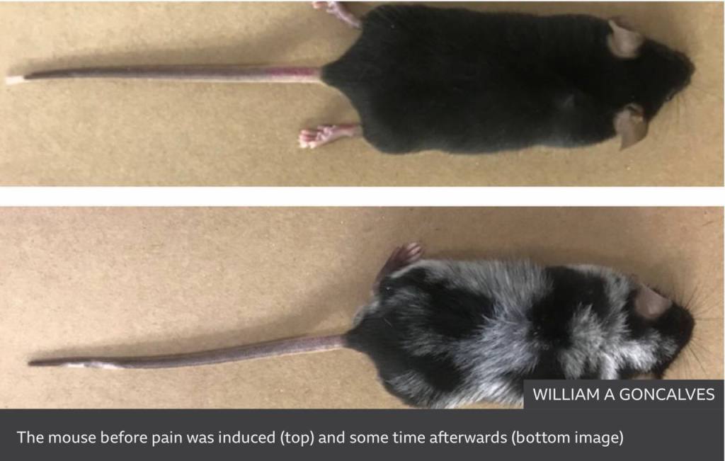 Psychological stress (စိတ်ဖိစီးအောင်လုပ်တာ) စတဲ့ stress တွေပေးပြီးစမ်းသပ်တဲ့အခါ ရက်သတ္တတပတ်ကြာပြီးနောက် ကြွက်မည်းတွေ တဖြေးဖြေး အမွှေးဖြူလာပါတယ်။