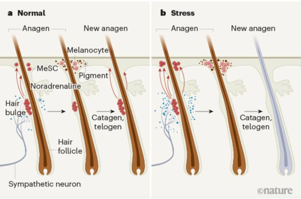 ဟိုတကွက်ဒီတကွက်ဖြူလာရင်း နောက်ဆုံး သိသိသာသာ ဖြူဆွတ်လာပါတယ်။ ကြွက်တွေရဲ့စမ်းသပ်ချက်အရ စိတ်ဖိစီးရင် stress hormone တွေထွက်လာပြီး ဆံပင်အမြစ်က stem cell တွေကို အပြင်ထွက်အောင်လုပ်ပလိုက်ပါတယ်။ Stress များလေလေ stem cell တွေတဖြေးဖြေးကုန်သွားပြီး အမွှေးတွေဖြူလာပါတော့တယ်။