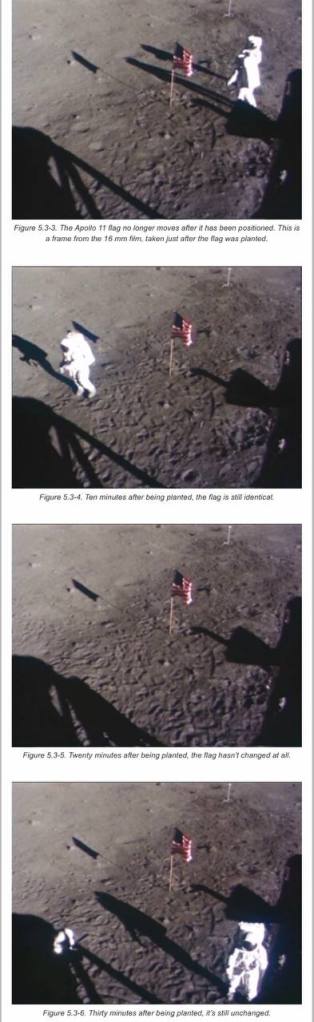 တကယ်ဆို လေမရှိတဲ့ လေဟာပြင်အာကသထဲမှာ အလံကလွင့်နေစရာအကြောင်းမရှိပါဘူး။ ဒါသက်သက် လုပ်ကြံပြီး ကမ္ဘာပေါ်မှာပဲ ရိုက်ထားတဲ့ဓာတ်ပုံလို့ဆိုကြပါတယ်။