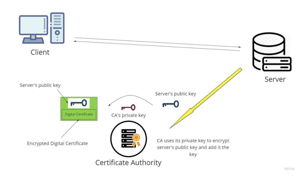 ဒီအခါမှာတော့ client နဲ့ server နဲ့ဆက်သွယ်မှုတွေမလုပ်ခင်မှာ server က certificate authority နဲ့ အရင် ချိတ်ဆက်ထားရပါတယ်။ ကားလိုင်စင်ဝင်ထားသလိုပါပဲ။ အရင်ဆုံး server ရဲ့ public key ကို certificate authority ထံပေးပို့ရပါတယ်။ ပေးပို့လာတဲ့ public key ကို certificate authority ကသူ့ရဲ့ private key ကိုသုံးပြီး encrypt လုပ်လိုက်ပါတယ်။ လုပ်ထားတဲ့ encrypted message ကို digital certificate လို့ခေါ်တာပါ။ ပြီးတော့မှ certificate authority က server’s original public key + digital certificate ကိုတွဲပြီး server ဆီကို ပြန်ပို့ပေးပါတယ်။
