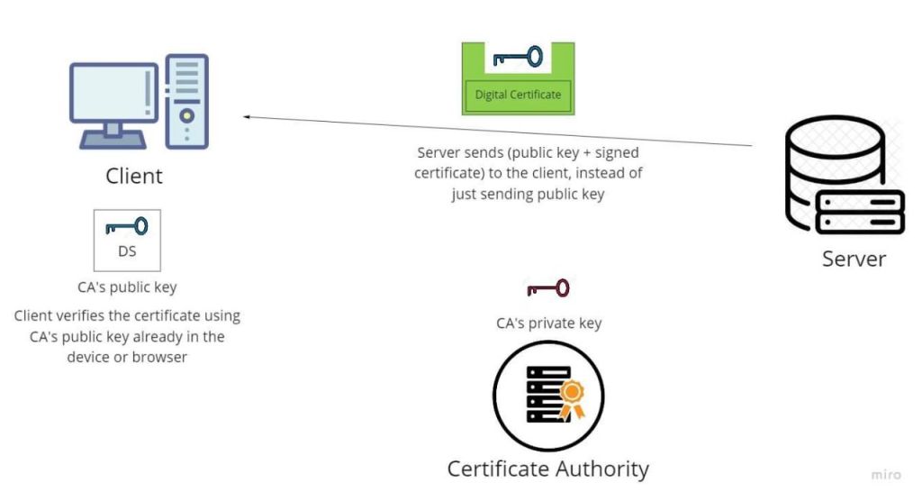 ဒါဆိုရင် client ကဆက်သွယ်လာတဲ့ အခါမှာ server က အရင်လို public key တစ်ခုတည်းကိုပဲ တန်းမပို့တော့ပါဘူး။ သူရဲ့ public key + digital certificate ကိုအမြဲတွဲတွဲပို့ပါတယ်။ client အနေနဲ့ ထိုအတွဲ ကို လက်ခံရရှိတဲ့အခါမှာ အရင်ဆုံး digital certificate ကိုကြည့်ပါတယ်။ ဘယ် certificate authority က လက်မှတ်ထိုးပေးထားသလဲ ဆိုတာပေါ့။