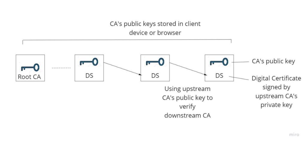 ထူးခြားပြီး ကျနော် အပေါ်မှာ mention မလုပ်ခဲ့တာတစ်ခုက ပထမ certificate authority (server ရဲ့ certificate authority) ရဲ့ public key မှာလည်း digital certificate တစ်ခုတွဲပြီး ပါရှိနေပါတယ်။ အဲ့ဒီ digital certificate ကိုလည်း certificate authority နောက်တစ်ခုခုက sign လုပ်ပေးထားတာပါ။