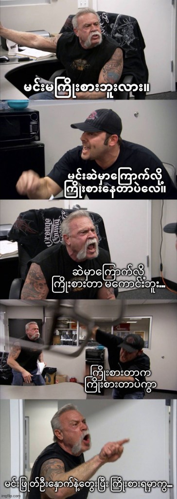 အလုပ်ပြုတ်သွားရင် မိသားစုဒုက္ခရောက်မယ်… ဒီတော့ အလုပ်မှာတော်လာအောင် ကြိုးစားတယ်။ မိန်းမက ချမ်းသာချင်တော့ နားပူနားစာလုပ်တတ်တယ်… ဒီတော့ ငွေပိုရအောင် နောက်အလုပ်တစ်ခု ရှာချင်တယ်။