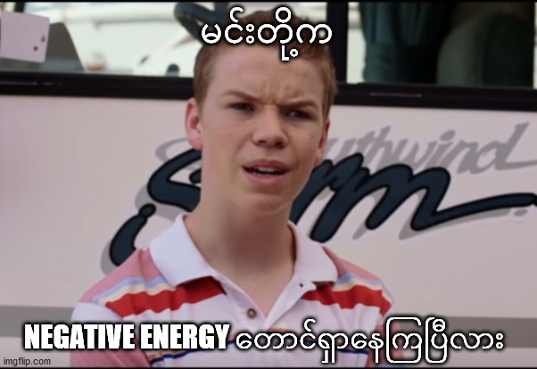 မြင်အောင်ပြောရရင် Negative Matter ဆိုတာ ပေါင်ချိန်လိုက်တဲ့အခါ -50kg (အနှုတ် ၅၀ ကီလိုဂရမ်) ဆိုပြီးပေါ်နေတာမျိုးပါ။ Negative Energy ဆိုတာလည်း အနှုတ်တန်ဖိုးတစ်ခုဆောင်နေတဲ့ Energy ပါပဲ။ ဒါတွေက ဘာလဲဆိုတာ စဉ်းစားကြည့်လို့တောင် မလွယ်ပါဘူး။