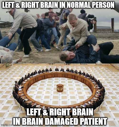 ဥပမာ “လက်က အကြောသေနေတယ်နော်” လို့ တွေးမိတဲ့အခါ ဘယ်ဦးနှောက်က “စိတ်မပူနဲ့ ဘာမှမဖြစ်ဘူး… ဒါက မင်းအမေရဲ့လက်ကြီး… မင်းကို စနေတာ” လို့ ပြန်ပြောနိုင်ပါတယ်။ သာမန်လူမှာဆိုရင်တော့ ဒါကို Counter လုပ်ဖို့ ညာဦးနှောက်က “အဓိပ္ပါယ်မရှိတာတွေ လာမပြောနဲ့… မင်းလက်က တကယ်အကြောသေနေတာ” လို့ ပြန်ပြောနိုင်ပါတယ်။