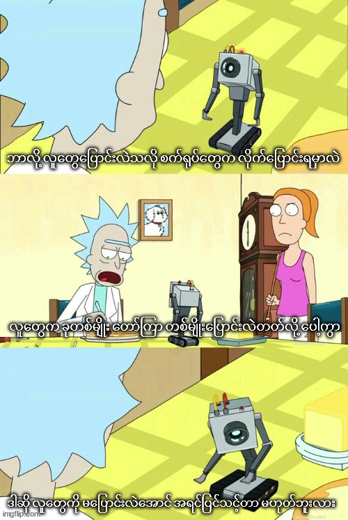 AI တွေကလည်း လူတွေကို မသေစေချင်ပါဘူး။ ဒါပေမယ့် သူတို့လုပ်ရမယ်လို့ သတ်မှတ်ထားတဲ့ Program အရ လိုအပ်တဲ့ကုန်ကြမ်းပစ္စည်းတွေဖြစ်တဲ့ Atom တွေနဲ့ လူတွေကို တည်ဆောက်ထားပါတယ်။”