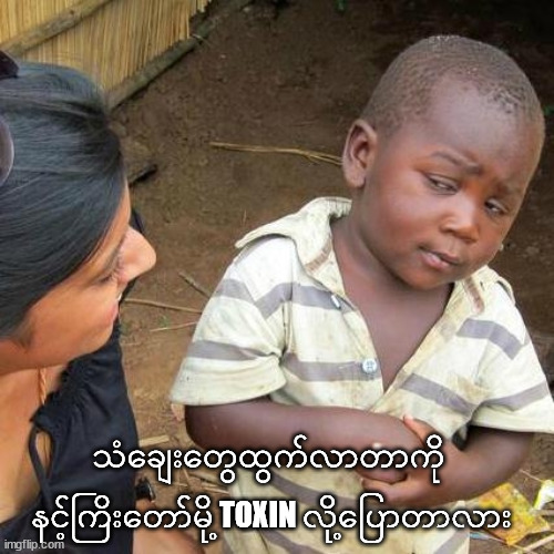 ပညာရှင်တွေက Toxin ဆိုတာကို စိတ်ဝင်စားကြပါတယ်။ ဘာလို့လဲဆိုတော့ ဆေးကျောင်းမှာ ခန္ဓာကိုယ်ကထွက်တဲ့ Toxin တွေကိုသင်ခဲ့ရပါတယ်။ ဒီတော့ ဘယ်ဟာကို ဒီနည်းနဲ့ထွက်သွားအောင် လုပ်နေတာလဲဆိုတာ သိချင်တာပေါ့။ Detox Products တွေရောင်းတဲ့ ကုမ္ပဏီတွေကို မေးရင် အဖြေတိတိကျကျ မရပါဘူး။ ဝေ့လည်ကြောင်ပတ်လုပ်နေတယ်လို့ ဆိုတယ်။ ကုမ္ပဏီတွေ အလွတ်ကျက်ထားကြတာက “ဒီနေ့ခေတ်မှာ Stress တွေအရမ်းများကြောင်း၊ လေထုညစ်ညမ်းမှုတွေ ပိုဆိုးလာကြောင်း၊ Fast Food တွေစားတာများလာကြောင်း” စတာတွေပါပဲ။