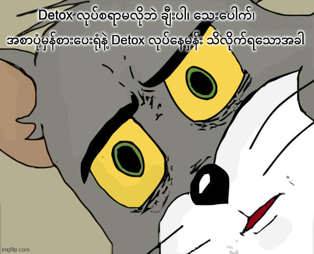 Detox လုပ်တယ်ဆိုတာ ကျန်းမာချင်လို့ဆိုပြီး ကျွန်တော်ကတော့ ယူဆပါတယ်။ ဒါပေမယ့် အလွယ်လမ်းလိုက်လွန်းနေတာ ဖြစ်နိုင်ပါတယ်။ အကြောက်လွန်တာလည်း ဖြစ်နိုင်ပါတယ်။