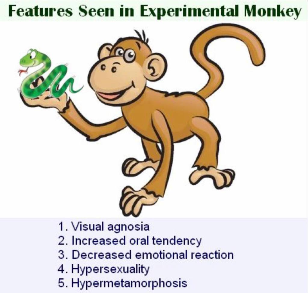 စမ်းသပ်ချက်မှာ မျောက်ဦးနှောက်ရဲ့ temporal lobe ဆိုတဲ့အပိုင်းကို ဘယ်ရောညာရောဖြတ်တောက်လိုက်ပါတယ်။ ပြီးတဲ့အခါ မျောက်ကိုခေါင်းပြန်ချုပ်ပေးလိုက်ပြီး ဘာတွေပြောင်းလဲသွားလဲဆိုတာစမ်းသပ်ပါတယ်။