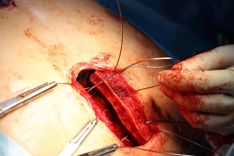 ရင်ညွန့်ရိုး (Sternum) ကိုချိုးပစ်ရပါတယ်။ ဒါမှအောက်က နှလုံးရယ် သွေးကြောတွေရယ်ကို မြင်ရမှာပါ။
