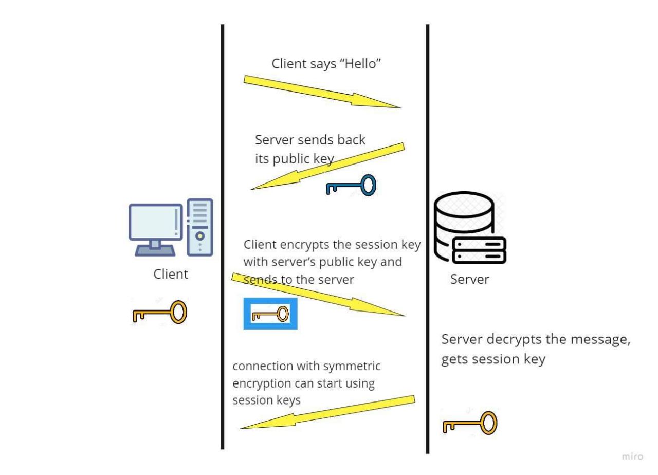 အဲ့ထဲက တစ်ချောင်းကို client က server ရဲ့ public key ကိုသုံး encrypt လုပ်ပြီး server ကိုပြန်ပို့ပေးလိုက်ပါတယ်။ Server ဆီရောက်တဲ့အချိန်မှာ server ကသူ့ရဲ့ private key ကိုသုံး decrypt လုပ်ပြီး session key ကိုရရှိမှာဖြစ်ပါတယ်။